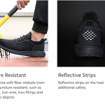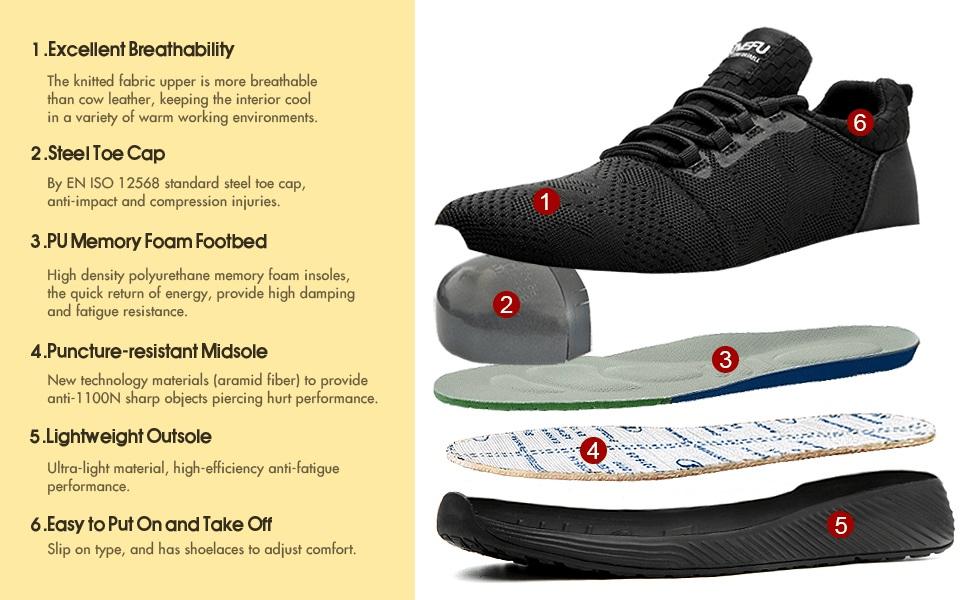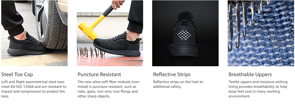 [SAFETY PROTECTION]Left and right asymmetrical steel clad head with ASTM F2413-18 I/75 C/75 rating to prevent heavy objects from smashing; soft Kevlar midsole to avoid puncture injuries from nails; glass and other sharp objects.
