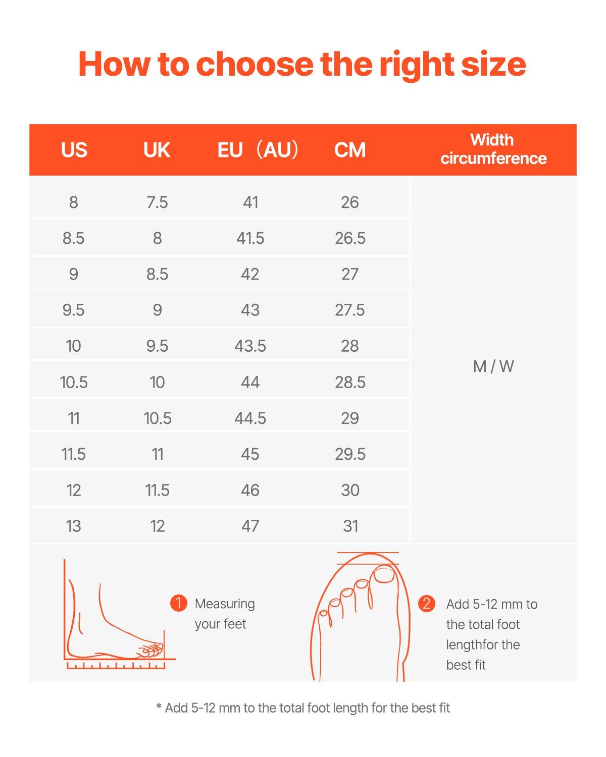 4.Size Selection: We offer sizes from 8 to 13, with both M and W width options available. You can easily choose the right size based on your foot length and width, ensuring a comfortable and secure fit for all-day wear.